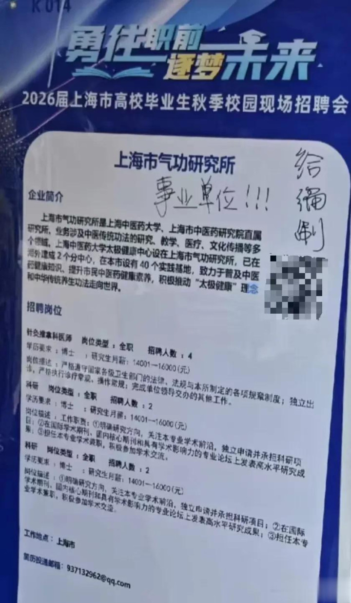 有网友发布了一张“2026年上海市高校毕业生秋季现场招聘会”的宣传图,其中招聘单位为“上海气功研究所”,招聘针灸推拿科医师、科研等岗位,引发网友关注。